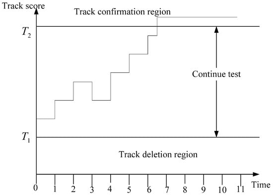 The track score can be expressed by the log likelihood ratio of the association hypothesis []. At scan k, a recursive form of the track score can be written as:
