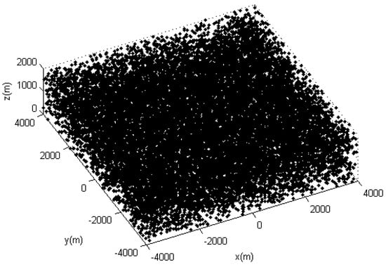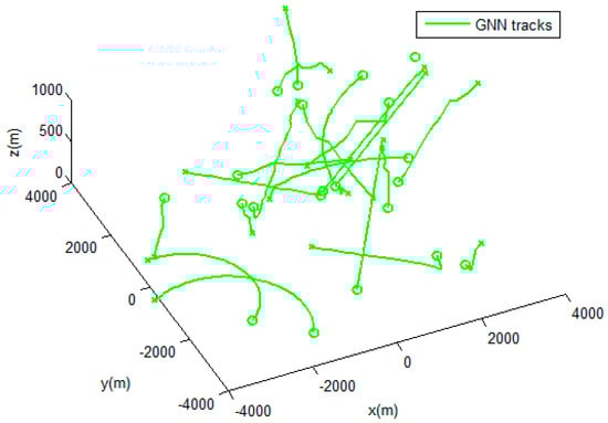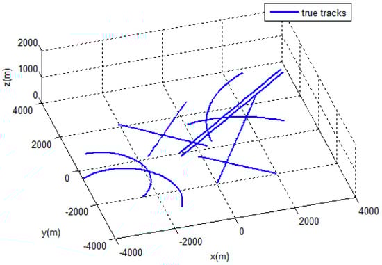 In the simulation scenario, we had 10 motion targets distributed in a space of [−4000, 4000 m]  [−4000, 4000 m]  [0, 1000 m]. We assumed a sampling interval . The measurements covered 100 scans. Figure 3 shows the trajectories of the target, and Figure 4 shows the target measurements with the dense clutter.