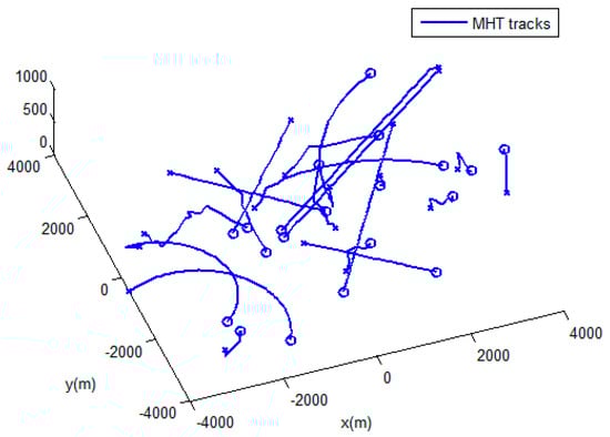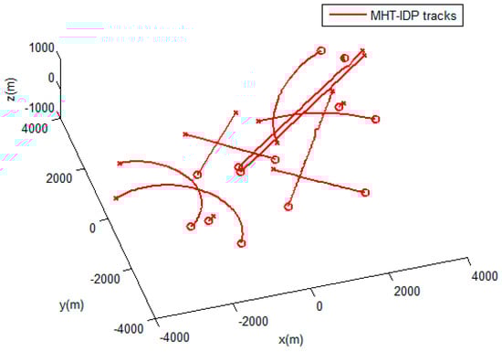 The performances of the MHT-IDP algorithm, the MHT algorithm, and the GNN algorithm are shown in Table 1 and Figure 5, Figure 6, Figure 7, Figure 8, Figure 9, Figure 10 and Figure 11. It can be clearly seen that, compared to the conventional GNN algorithm and the MHT algorithm, the MHT-IDP algorithm had fewer false tracks, less clutter, and less mutual interference; thus, it presented a better tracking quality.