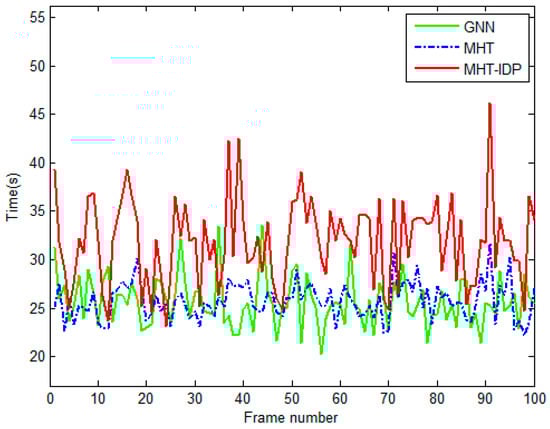 Table 1 illustrates the tracking performance of the three algorithms under several metrics. Compared with the MHT algorithm and the GNN algorithm, the MHT-IDP algorithm had a lower miscorrelation rate of true tracks  and a higher correct correlation rate of true tracks . Thus, the MHT-IDP algorithm had a better accuracy of data association. Furthermore, the MHT-IDP algorithm had a smaller average number of false tracks . This means that the MHT-IDP algorithm could effectively reduce the number of false tracks. Moreover, the MHT-IDP algorithm had a longer average processing time for per scan  than the MHT algorithm and the GNN algorithm, which means that the MHT- IDP algorithm obtained better tracking effect at the expense of more computation time.