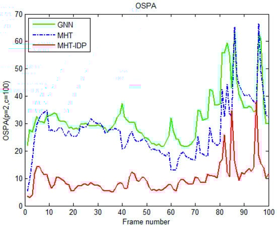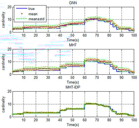 Figure 9 and Figure 10 show the OSPA distance and the cardinality estimation of three algorithms. It can be seen that the MHT-IDP algorithm had a lower average OSPA distance. Moreover, the mean value of cardinality estimation was closer to the actual target number, and the covariance of cardinality estimation was smaller. These simulation results prove that the proposed algorithm can acquire better estimation performance.