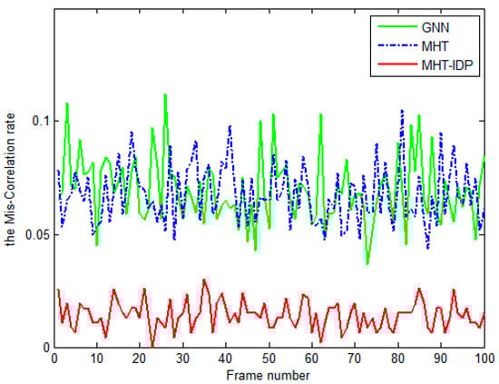 Figure 11 shows the true tracks miscorrelation rate of three algorithms. The means of the miscorrelation rate of true tracks of the GNN algorithm, the MHT algorithm, and the MHT-IDP algorithm were 0.0697, 0.0676 and 0.0142, respectively. According to Figure 11, we can see that the MHT-IDP algorithm effectively reduced the miscorrelation rate of true tracks.