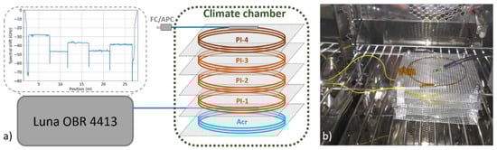 For the temperature-humidity characterization, roughly 5 m long segments were cut from each fiber and coiled into small spools with diameter of 6–8 cm. The individual spools were put into a compact shelf-type holder at separate levels and spliced together in order to allow simultaneous measurement of all fibers in series. The order of the fibers in the series as they were interrogated throughout the study is indicated in Figure 1a. Additional FC/APC pigtails were spliced at the beginning and the end of the fiber series for easy connection. The fiber holder was placed inside of a climate chamber while the pigtails were fed through a side opening outside to connect to a measurement device. A digital environmental sensor Ahlborn FHAD460L10 was placed inside the climate chamber close to the fibers for additional temperature and RH validation (Figure 1b). All the experiments were performed using Vötsch VCL 4003 climate chamber (CC) allowing simultaneous programmable control of temperature and relative humidity in 10–95 °C and 10%–95% range, respectively. Optical backscatter reflectometer OBR 4413 from Luna Technologies, based on swept-wavelength interferometry (sometimes also referred to as optical frequency-domain reflectometry) in the 1310 nm spectral region, was used to measure fiber temperature and RH response. Detailed explanation of OBR operating principle goes beyond the scope of this paper and can be found, for example, in ref. [25,26]. In short, the technique allows high-resolution distributed measurement of relative strain- or temperature-induced changes in fiber Rayleigh backscatter profile by cross-correlating local backscatter spectra from actual and reference measurements in the frequency domain. The measurement technique was selected due to its high sensitivity and spatial resolution, which is beneficial for the intended lab-scale characterization and demonstration. Nevertheless, the presented working principle and qualitative conclusions on fiber performance also remain valid if other DFOS techniques allowing distributed temperature and strain measurement are used.