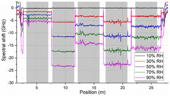 Illustration of measured optical backscattering reflectometry (OBR) spectral shift traces at different moments throughout a humidity characterization cycle (at 20 °C) corresponding to different relative humidity (RH) levels. Gray shaded areas indicate five sections for individual fibers that were considered for further data processing.