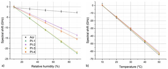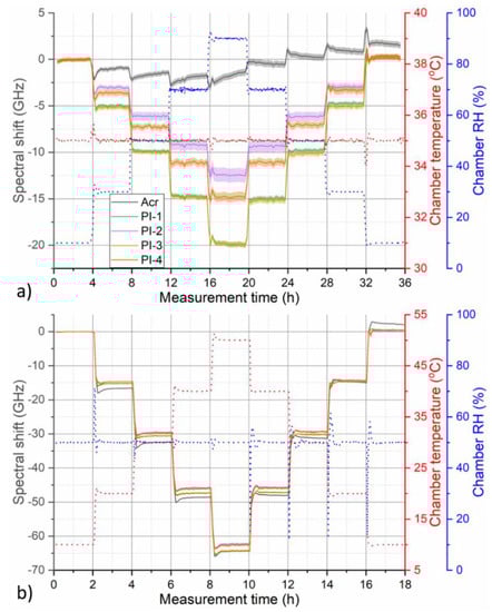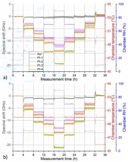 For humidity cycle at this temperature, slight hysteresis became visible even for pristine PI-coated fibers as the measured spectral shift curves did not return to their original zero value (Figure 4a). Annealing helped to minimize this hysteresis (Figure 4b). In addition, magnitude of RH response of PI-coated fibers increased slightly after annealing. Finally, the decreased uncertainty in displayed spectral shift curves indicates that annealing might also help to homogenize humidity response along the fiber. This is especially visible in the case of PI-2 and acrylate-coated fiber. Thermal pre-annealing might lead to relaxation of structural inhomogeneities in the coating polymer matrix that could be causing differences in humidity response along the fiber as observed in Figure 2. On the other hand, no significant improvement in the response of acrylate-coated fiber was observed after annealing. In fact, our investigations revealed that even after annealing, humidity response of the acrylate-coated fiber remains rather nonlinear with complex temporal character and strong temperature dependence.