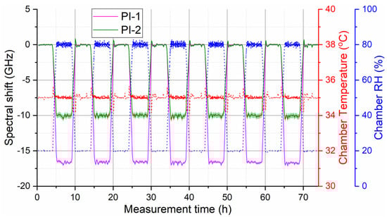 Stability and reproducibility of fiber humidity response is important for the reliable sensor operation. Figure 6 depicts the evolution of humidity-induced OBR spectral shift for the both selected fibers during climate chamber program with seven cyclic RH changes between 20% and 80% RH at a constant temperature of 35 °C measured over 74 h. The measurement confirms good stability and reproducibility of humidity response for both selected fibers after annealing.