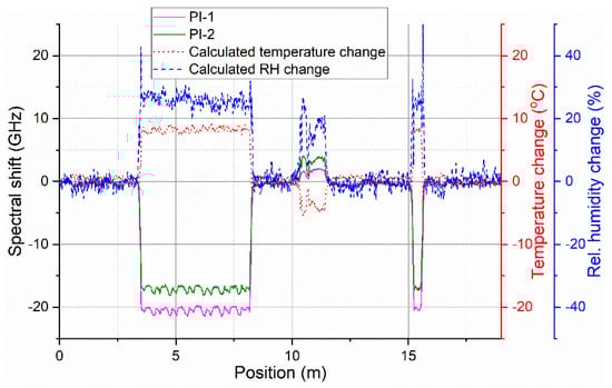 To test possibility of distributed environmental sensing, two sections of the prepared sensing cable were put into the climate chamber. A roughly 5-m-long section of the cable (3–8 m from the connectorized end of the cable) was coiled inside of the climate chamber. An additional 0.5-m-long section (roughly at 15 m from the connectorized end of the cable) was fed directly (straight) through the side openings of the chamber. The rest of the sensing cable was placed freely around the room. Spectral shift evolution from the entire cable was recorded during a 54-h climate chamber program with simultaneous change of temperature and RH. The program consisted of two temperature ramp cycles between 20 °C and 40 °C and a simultaneous step-wise RH cycle from 10% to 90% and back in 20% steps. Automated Luna OBR measurement every 20 min, with the same settings as for general fiber characterization, was used. To decouple the effects of temperature and RH, separate spectral shift traces from the two sensing fibers were overlaid in the postprocessing and relative change of temperature and RH were calculated using Equations (2) and (3), respectively, at each point along the sensing fiber. The process is illustrated in Figure 8.
