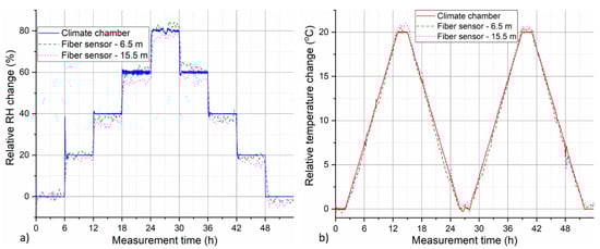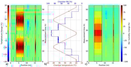 Figure 9 depicts the overall 3D maps of calculated spatial-temporal distribution of relative temperature and RH change along the sensing cable during the temperature-humidity cycle. Both longer and shorter sensing cable segment inside of the climate chamber are clearly identifiable as they exhibit noticeable temperature (Figure 9a) and RH (Figure 9c) change that appears to follow the climate chamber program (Figure 9b). Temperature ramps as well as step-wise relative humidity cycle is clearly visible for the calculated decoupled 3D temperature and RH maps. The signal from the rest of the sensing cable outside of the climate chamber stayed relatively stable, indicating stable environmental conditions in the room. A notable exception is the section roughly at 10–11 m. This corresponds to the cable section that was placed deliberately directly into an open window and the observed temperature and RH changes reflect day cycle of outside environmental conditions.