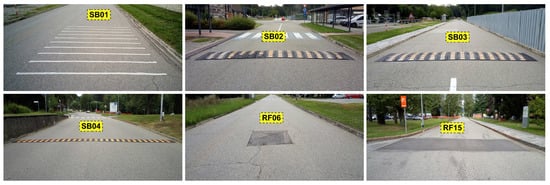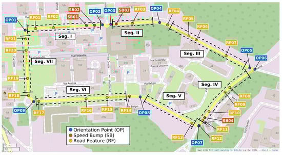 The goal of the experiment was to obtain cars’ driving characteristics under comparable driving conditions. We planned an Experimental Lap (EL) (in the rest of this paper, the term EL and lap will be used with the same meaning) inside the Joint Research Centre (JRC) area with conventional road rules and realistic traffic. This lap had a length of 2065 m and average driving time of 182.5 s (see Figure 1). To collect the measurements, every car had to drive this lap for at least twenty times in a row with just a tiny stop between each other (from 2 to 10 s). We distinguish and label the three types of points on the EL as follows—Orientation Point (OP) (e.g., any kind of left or right turn that we later used to separate the smaller parts of the EL), Speed Bump (SB) (e.g., four big speed bumps spread through the EL) and Road Feature (RF) (any roughness on the surface of the road, such as speed bump or an asphalt joint). Examples of those points with their descriptions and Global Navigation Satellite Systems (GNSS) positions are in Table 1. The disposition of the points is also marked in the map of the EL (see Figure 1), the photo documentation of the most significant ones is shown in Figure 2 and a description of the most significant points with the related latitude and longitude is provided in Table 1. The EL starts at and continues in clockwise.