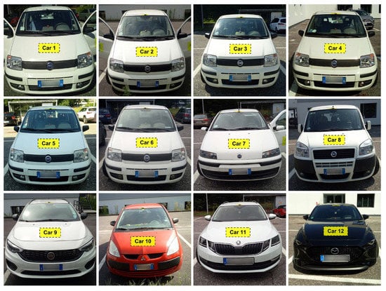 For the IMU, we used the microelectromechanical system based motion tracker supplied by Xsens with the model number (Xsens Technologies B.V., Enschede, The Netherlands). This sensor device is designed to measure the three axis acceleration and rate of turn in 2000 Hz sample rate and three axis magnetic field in 100 Hz sample rate. The IMU was mounted using a strong double sided foam tape at the same spot and orientation for every car. For details see Figure 3. We decided to place the sensor on the top of car’s dashboard in the middle of the car. No measuring tools were used and the alignment was fully empirical. The x-axis of the IMU was always pointing towards the driving direction and z-axis in the vertical direction. The car position was also recorded using the GNSS receiver with the antenna mounted on the car’s roof. The set used for this experiment consisted of twelve different cars. The specifications of the vehicles are listed in Table 2 and the photo documentation of those cars is in Figure 4. The same driver and co-driver were present in every car during the experimental data collection (i.e., driving the car) to minimise the potential bias of the driver. We highlight that half of the used vehicles were of the same model (Panda Active). The choice of such datasets with a predominance of vehicles of the same model and brand was intentional. While, this aspect is not quite relevant in the continuous authentication of human beings (because each human being is unique), this aspect is quite relevant in device authentication as discussed in the related literature [], where it is discussed how intra-model classification is more difficult than inter-model classification (because components of the same model are the same or similar). To clarify—intra-model classification is when the devices are of the same model and brand (e.g., mobile phones of brand/model Sony Experia or Fiat Panda as in this scenario), while inter-model classification is when devices are of a different brand and/or models. We wanted to target the most difficult problem of intra-model classification rather than inter-model. This is why we have used a majority of vehicles of the same brand and mostly of the same model.