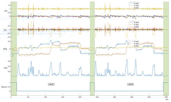 The second step is to synchronize the data recordings and to extract the identified laps. To facilitate this step, each lap driving was performed in the following way—the car was stationary on at the beginning of each lap with a running engine for 10 s. This initial Background Noise Window (BNW) segment was used for laps synchronization and extraction. To compute an overall motion of the car the Kalman filter is used to estimate three dimensional angular velocity from the gyroscope sampled to 20 Hz. The variance computed from the BNW is used as a filter parameter for the noise reduction. Then the computed angular velocity is normalized to only one dimension and the one-dimensional convolution is applied. The convolution matrix is normalized to 20 elements long (due to the 20 Hz down-sample frequency). The start and end of each lap is calculated using the value of the angular velocity, when it is less than the threshold for the specific time defined above. The output of this procedure is a time table with starting and ending times of each lap. A description of the pseudo algorithm is shown in Algorithm 1. The visualization of the synchronization and laps extraction for the first two laps is shown in Figure 6.