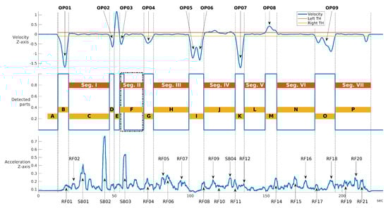 An example of the segments identified in a lap of the first car. The first plot shows the convoluted z-axis of the axial velocity with its positive (right turn) and negative (left turn) threshold. The Operational Point (OP) positions from Figure 1 are marked above in form of text arrows. The detected turns are shown at the second subplot (1 means turn and 0 means straight drive). The vertical gray lines separates different segments which are individually marked by yellow rectangles with alphabetical letters. Those letters represents segment names and stands for: A-Start, B-StartTurn, C-FastFirstBump, D-PreRound, E-RoundOne, F-SecodBump, G-RightCurve, H-WindowOne, I-CrossOne, J-VisitBump, K-CrossTwo, L-WindowTwo, M-LeftCurve, N-WindowThree, O-RoundTwo, P-WindowFour. The orange rectangles identify the seven segments used for the machine learning classification. The last subplot shows the z-axis of the acceleration with the identified EL road landmarks from the Figure.