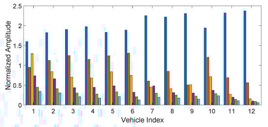 The other technique is based on the transformation of the signal from the IMU recording in the frequency domain using the FFT. Then, the frequency domain representation is divided in segments (i.e., frequency bands) with a number , which is one of the hyper-parameters identified in the Section 5. The Root Mean Square (RMS) of each frequency band is calculated to obtain features. This approach is similar to the continuous authentication approaches for human beings, which are described in the related work in References [,]. The rational for this approach in vehicle authentication is that the main components of a vehicle (e.g., tyres, absorbers and wheels) will have smoother or harder reactions to road irregularities depending on the vehicle model. The smoother or harder response corresponds respectively to a lower occupation of the frequency bands or a higher occupation of the frequency bands. This can be seen from Figure 8, which shows the amplitude frequency representation with of each vehicle for the same segment I using a sample rate of 500 Hz and . It can be seen from the Figure that the first 6 vehicles (all Pandas) have a similar distribution of the amplitude coefficients, while the other vehicles have a different distribution. In more detail, the amplitude of the second frequency component is only slighter less than the first frequency component, while there is wide gap between the amplitude of the first and second frequency components in the vehicle number 12, which is of a completely different brand and model and more importantly of a different class—sport car. On the other side, the frequency response can depend by many different factors including the speed of the vehicle and how it can change from one lap to another. Then, the goal is to identify the optimal hyper-parameters, which can optimize the vehicle classification regardless of the vehicle speed. Note that the frequency representation of a time series is complex and it is not known a priori which components of the time series representation are useful for classification. As shown in the results Section 5, the magnitude component of the frequency domain representation is much more relevant for classification than the phase component. Because of these reasons, the amplitude component of the FFT transform is used. It could be argued that other spectral representations apart from the one based on FFT could also provide a good classification accuracy. This paper has also used a wavelet based representation but the results are slightly worse than the frequency domain representation as shown in Section 5.