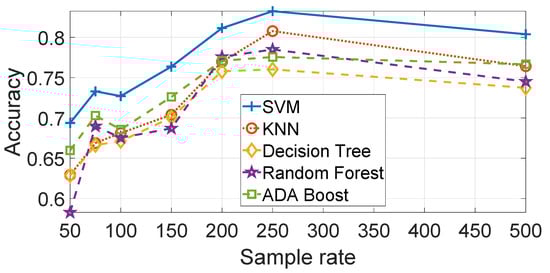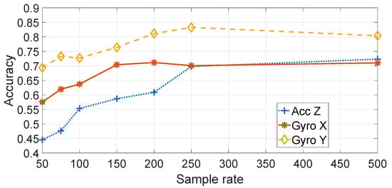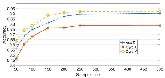 Figure 9 shows a comparison of the different components (e.g., accelerometers and gyroscopes) and directions (e.g., ) for the application of the statistical features approach on the basis of different sample rates. The SVM machine learning algorithm was used. As discussed before, only the Accelerometer in the Z direction ( in the rest of this paper), the Gyroscope in the X direction ( in the rest of this paper) and the Gyroscope in the Y direction ( in the rest of this paper) are considered. As discussed before, the direction has been adjusted from the initial recordings to be in the direction of travel of the vehicle. Figure 9 shows that the highest classification accuracy is obtained by using , which is reasonable, because the pitch of the vehicle is more strongly stimulated by irregularities in the road surface. Figure 9 also shows that the accuracy improves with the increase of the sample rate. This result may be explained by the consideration that a higher sample rate provides more details and more discriminating power in the application of the features or the spectral transform with the machine learning classification. Evidence from studies on device identification in general supports this hypothesis []. As the classification is higher with , the subsequent results are based on .