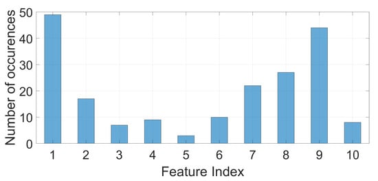 The histogram in Figure 10 shows the occurrences of the best four ranked features of RelieFF across all the best seven selected segments and the different samples rates (i.e., for each segment and each sample rate the highest four ranking features are selected) for . The histogram shows that the most relevant features are—feature 1 (Variance), feature 8 (Permutation Entropy with ) and feature 9 (Approximate Entropy).