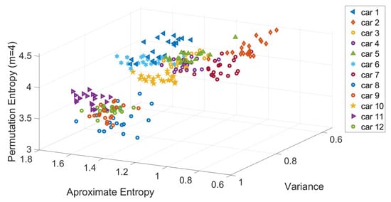 A visual representation on how the features identified from Figure 10 are relevant for the classification of the specific vehicles is shown in Figure 11, where a scatter plot for three selected features mentioned above (i.e., Variance, Permutation Entropy and Approximate Entropy) is shown. The scatter plot is based on Gyroscope Y with a sample rate of 500 Hz. Each of the points shown in the scatter plot of Figure 11 represents each of the EL for each vehicle.
