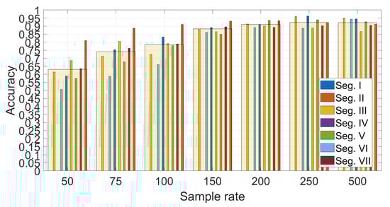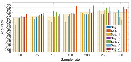 Figure 12 shows the detail on the accuracy obtained foreach segment using and SVM with optimized hyper-parameters ( and ). The average values across segments are also indicated with a transparent bar for each sample rate. The Figure 12 provides two significant results—the first is that the sample rate greatly impacts the classification accuracy. a higher sample rate provides more discriminative value than a lower sample rate as the identification accuracy increase steadily with the sample rate from 50 Hz to sample rate equal to 250 Hz. Then, an even higher sample rate does not improve the identification accuracy. This is an important result, because it shows that there is no need to use very high sample rates, which would not be practical for a deployment of continuous authentication using smartphones (i.e., current mass market smartphones have a sample rate around 100 Hz–200 Hz). The second result is that the choice of the segment can impact the identification accuracy. The Figure shows that the identification accuracy can vary greatly among the different segments and these results for the statistical features approach (a similar analysis is provided below for the spectral approach) can provide an insight into which road segments can be preferred in this authentication approach. For example, it can be seen that the segment III provides across all the sample rates a lower identification accuracy than the other segments. If we compare the results in Figure 12 with the results in Figure 7, it can be seen that segment II provides in general a higher identification accuracy (especially with sample rates at 150 Hz and 200 Hz) which can be related to a higher variance of the accelerometer in the Z direction due to the presence of irregularities of the road surface including the speed bump SB03. Then, we can conclude that the presence of irregularities on the road surface or a greater road roughness can provide a higher identification accuracy. This also means that smooth surfaces like a highway may provide a lower identification accuracy. Segment III, which does not provide a high classification accuracy, does not have specific road surface irregularities (see the map in Figure 1) and it could be considered similar to the Highway case.