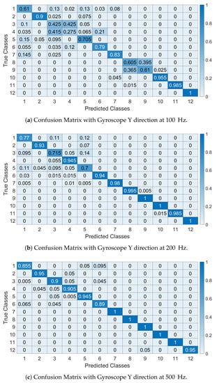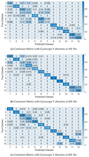 Figure 22a–c show the confusion matrices using the spectral approach with Gyroscope Y for Segment I (similar results are obtained for the other segments) and with an IMU recording sampled respectively at 100 Hz, 200 Hz and 500 Hz. The confusion matrices confirm the previous Figures obtained for the identification accuracy. As in the case of the feature based approach, the first 6 vehicles (i.e., of the same Panda model) are more difficult to distinguish than the other vehicles as expected because they have similar mechanical features.