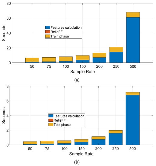 Time needed to execute the statistical features approach (sample rate in Hz). (a) Time needed to execute the training phase using the statistical features approach and the Ada Boost algorithm; (b) Time needed to execute the testing phase using the statistical features approach and the Ada Boost algorithm.