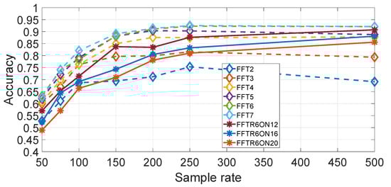 In this approach, the hyper-parameter is the number of coefficients in the spectral domain. Then, the optimal value of must be identified but cannot be large because of the curse of the dimensionality, then it is decided that is limited to 6. On the other side, a feature selection process as in the feature approaches can be used with a value of greater than 6. Figure 16 shows a comparison of different values of using for different values of the sample rates, where only a limited set is used when is greater than 6. It can be seen that the optimal performance curve is obtained for . We note that a value of was also used to make a comparison (thus contrary to the rule defined above), but it can be seen that there is no significant improvement of against . The use of higher numbers than (, and ) in combination with RelieFF shows that the identification accuracy is worst than with . By comparison, the results obtained in the previous section for the feature approach, it can be concluded that a higher accuracy is obtained by using the spectral approach than the feature approach. Two potential explanations are possible. One explanation is related to the physical response of the vehicle against irregularities in the road as different vehicles types have different automotive suspension components (e.g., coil springs and control arms), which produce a different frequency response on the same road segment. This can be a more distinguishing factor for vehicle types than the designed statistical features used in the feature approach. The second aspect is that the selected features in the feature approach are derived from the research literature on continuous authentication of human beings, which may not be fully appropriate to the continuous authentication of vehicles.