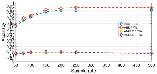 In comparison to the feature based approach, another hyper-parameter to select is the amplitude or phase component as the FFT provides complex values. An evaluation using , and averaged on all segments for different sample rates is shown in Figure 19. It can be seen that the amplitude component is much more significant than the phase component. The reason is that the amplitude part is directly related to the frequency response of the mechanical components (i.e., coil springs and wheels) of the vehicle while the phase is not (e.g., the reaction of vehicle to a bumper is mostly related to the speed of the vertical acceleration).