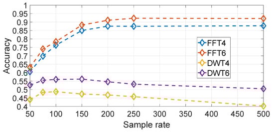 It could also be imagined that other transforms rather than the FFT transform could give better classification results. This hypothesis is evaluated in Figure 20 where a wavelet based transform (i.e., based on a Daubechies wavelet of order 10) is compared against the frequency domain approach for different sample rates, and both for wavelet and frequency domains representations. In both cases, the amplitude component of both transforms have been used. The result in Figure 20 shows clearly that the FFT based approach is significantly better than the wavelet based approach. Different wavelets have also been used with similar results.