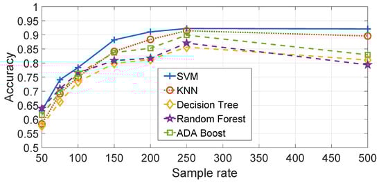 As discussed in the Section 4, different machine learning algorithms are used to produce the results. A comparison of the results using the data are provided in Figure 13. Each of the machine learning algorithms have been optimized in relation to their hyper-parameters. The optimized ML parameters are—SVM with and , KNN with Euclidean Distance and and Decision Trees with maximum number of splits . The Random Forest and Ada Boost algorithms (based on the Decision Tree) have also been optimized using the auto-optimization function of Matlab. Figure 13 shows that SVM has a better performance accuracy than the other machine learning algorithms, in particular KNN and the Decision Tree. Random Forest and Ada Boost performs better than the Decision Tree but less than SVM. The result is consistent for all the sample rates. Similar results are obtained for and but they are not presented to avoid an excessive length of this paper.