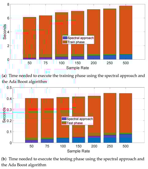 Time needed to execute the spectral approach (sample rate in Hz). (a) Time needed to execute the training phase using the spectral approach and the Ada Boost algorithm. (b) Time needed to execute the testing phase using the spectral approach and the Ada Boost algorithm.