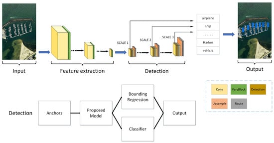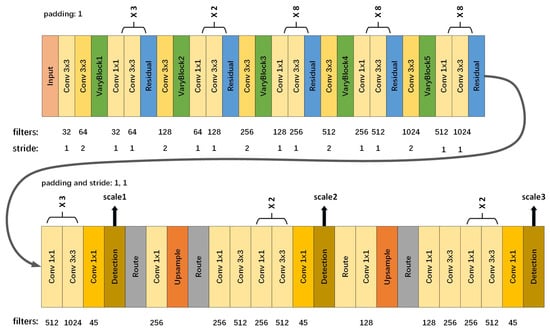 We directly use the detection part of YOLO as our backbone structure. Without huge modification, we only change the last route layer setting from to in order to fuse the underlying features instead of the middle layer features. Moreover, we alter the stride of the last Upsample layer from 2 to 4. In order to make small objects more easily to be detected, we use three different scales for detection. With 32 layers altogether, the detection model is composed of convolution layers, convolution layers, Unsampled layers and Detection layers. More specifically, three detection layers are included, corresponding to three scales—small-scale, medium-scale and large-scale. In particular, there is no Residual layer or varyblocks in the model. The output tensors of the detection model involve the information of predicted bounding boxes such as center coordinates, width, height, confidence score and class probabilities. The structure of the detection model is shown in Figure 6 (lower part). it should be noted that the left side is the input of the detection model and the output of the feature extraction model. More details can be found in Reference [].