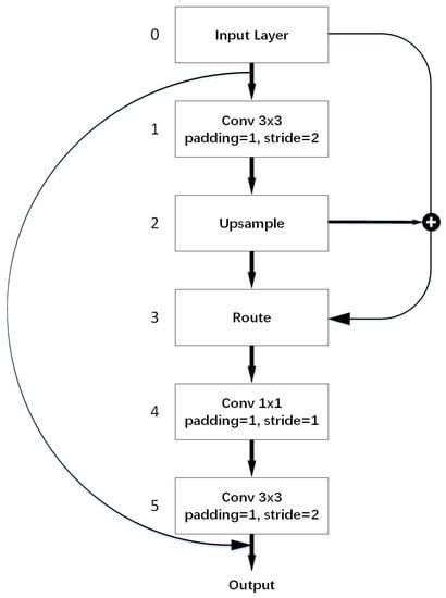 The third layer is the Route layer. The output of the Route layer is used to merge the Input Layer and the Upsample layer like a route sign pointing to the two layers we want to concatenate. Figure 4 shows the route operation in detail.