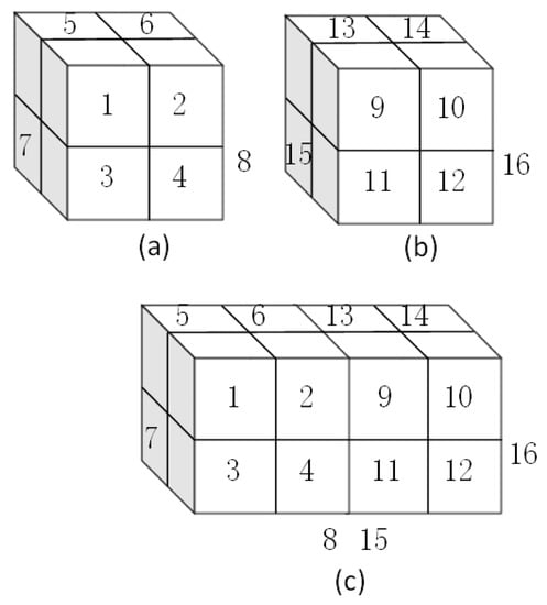 The route operation: (a) A = [[(1,2), (3,4)], [(5,6), (7,8)]];(b) B = [[(9,10), (11,12)], [(13,14), (15,16)]]; (c) C = [[(1,2,9,10), (3,4,11,12)], [(5,6,13,14), (7,8,15,16)]]. C is the route operation of A and B.