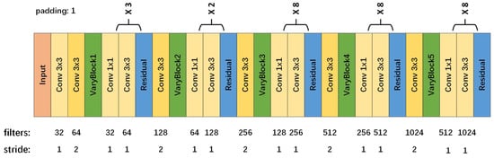 As is known above, VaryBlock provides a solution to make up for the deficiency of downsampling. It further enhances the performance of object detection. Consequently, we propose a feature extraction model to replace traditional downsampling with VaryBlock. We fed an input image through the fully convolutional network to build a rich feature representation of the original image. The model with a mixture of , convolution layer, VaryBlock and Residual layer should lead to excellent performance in feature extraction. Taking the Residual layer into account, there were 106 layers in total. Moreover, it has a top-to-bottom architecture and incredible feature extraction capability so that it can learn a lot of feature information that the general object detection model is unable to learn. In fact, it is a critical role to elaborately design the feature extraction model for object detection. The structure of the feature extraction model is shown in Figure 5.