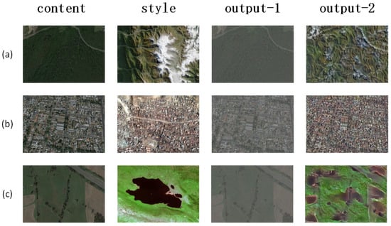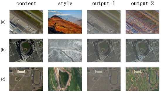 Positive samples after using cycleGAN. Given content and style, then generate the fake positive samples. output-1 and output-2 show two different fake samples. (a) Airport; (b) Baseball field; (c) Sports park.