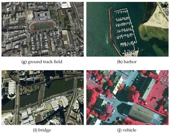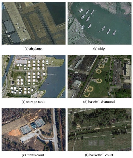 The utilized dataset contains the following 10 categories—airplanes, ships, storage tanks, baseball diamonds, tennis courts, basketball courts, ground track fields, harbors, bridges and vehicles. Some samples of the NWPU VHR-10 dataset are shown in Figure 10.