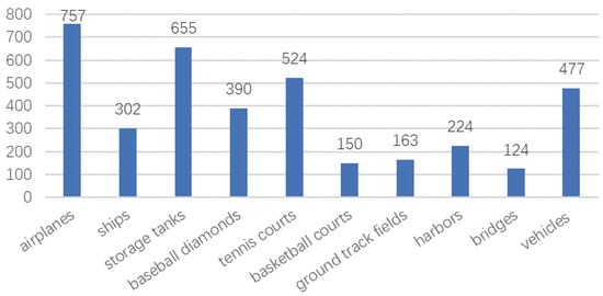 As for the positive image set, 757 airplanes, 302 ships, 655 storage tanks, 390 baseball diamonds, 524 tennis courts, 150 basketball courts, 163 ground track fields, 224 harbors, 124 bridges and 477 vehicles were manually annotated with bounding boxes and utilized as the ground truth []. The distribution of 10 classes in the NWPU VHR-10 dataset is shown in Figure 11.