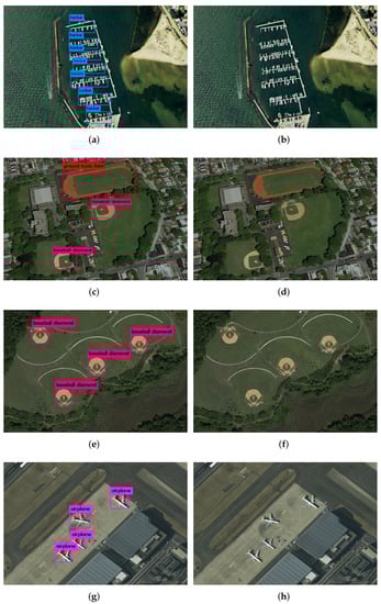 In this section, the dataset that we used to evaluate the effectiveness of our proposed algorithm for remote sensing object detection is introduced. The NWPU VHR-10 dataset is an open satellite image object detection dataset which contains totally 800 very-high-resolution (VHR) optical remote sensing images. Within the dataset, there are 715 images acquired from Google Earth with a 0.5–2.0 m spatial resolution and 85 pan-sharpened color infrared images with a 0.08m spatial resolution. It has two sub datasets, a positive dataset with 650 images and a negative dataset with 150 images. In each image in the positive dataset there exists at least one target to be detected and all images in the negative dataset do not have any target of the given classes to be detected []. Meanwhile, we simply and randomly divide the positive dataset into 70% for training and 30% for testing, respectively, namely 560 images for training, 140 images for testing.