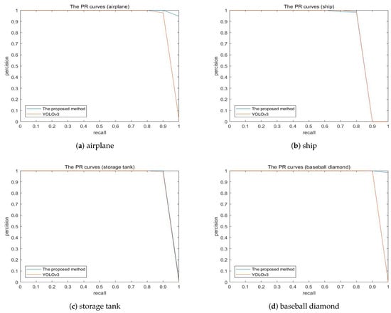 The precision-recall curves of the results using YOLOv3 and proposed method on the NWPU VHR-10 dataset.