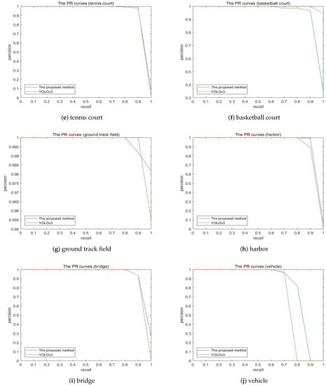 Compare our proposed algorithm with the baseline YOLOv3, the AP values of nine classes are increased, including airplane (0.909 to 0.995), storage tank (0.908 to 0.911), baseball diamond (0.909 to 0.998), tennis court (0.908 to 0.913), ground track field (0.9959 to 0.9976), harbor (0.899 to 0.912), bridge (0.903 to 0.927) and vehicle (0.724 to 0.799). Obviously, all classes have different levels of lift which can verify the robustness of our model. Meanwhile, the baseball diamond obtains the best performance, in comparison to other objects adopting the proposed method. Moreover, in comparison with the baseline, our proposed method behave little worse at two sorts. This may be caused by a variety of factors. However, the most likely reason may be that the images generated by cycleGAN have randomness, and different noises may result in slightly difference experimental results. In the future work, we will do further research on this case. Figure 13 show the precision-recall curves of the results using our proposed method and YOLOv3. The loss curves of our proposed method and YOLOv3 are illustrated in Figure 14.
