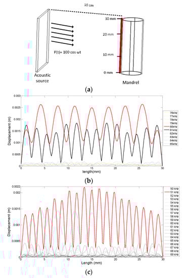 The mandrel shell displacement was measured on the red line on the mandrel shell, as illustrated in Figure 1a. The simulation results in Figure 1b,c show the mandrel shell displacement on the red line for different frequencies. They showed that the mandrel resonance frequency was approximately 80 kHz and 51 kHz in air and water, respectively. As predicted, the simulation results were in good agreement with the theoretical results.