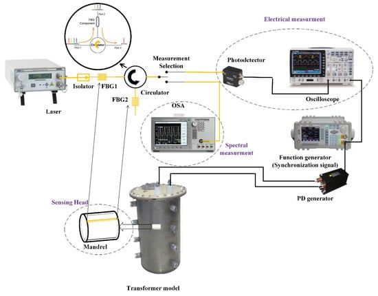 In recent years, there has been considerable interest in the use of fiber bragg grating (FBG) as a PD sensor [,,,,,]. Fiber bragg grating (FBG) sensors are reliable and stable, exhibit nearly flat and linear responses to sensing parameters, and have been used to sense different parameters, such as temperature, strain, pressure. FBG could be designed in specific applications by developing the technology. FBG is attached to Mandrel and cantilever with special glue to sense mechanical waves [,]. Michelson and Sagnac interferometers [,,] and different types of fiber, such as multimode fiber and a long-period grating (LPG) [,,,], have also been used to detect PD signals.