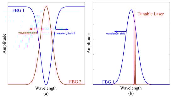 Another setup was implemented by one FBG and a tunable laser []. The tunable laser generates a narrow spectral bandwidth whose wavelengths can be tuned according to the FBG. However, in this setup, the wavelength of the tunable laser was fixed, and the wavelength of the FBG shifted in response to changes in the sensing parameter. With this setup, the sensitivity was reduced, and some other advantages were lost. Figure 3 shows the FBG spectra for the setups with one FBG and two FBGs.