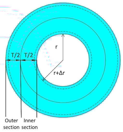 To simplify the sensitivity calculation, the mandrel shell was divided into inner and outer sections with equal thicknesses of (Figure 4). It was assumed that the acoustic pressure surrounding the mandrel was and that the volume changes in the inner section due to pressure were calculated as follows: