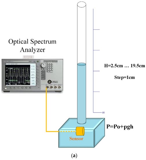 First, the sensor performance, which consists of two FBGs and a mandrel, was examined under static pressure. In real applications, the sensor is located in the transformer, and, considering its position, it must tolerate different static pressures of transformer oil. Therefore, feature identification under static pressure must be conducted in advance. The sensor was located in a container in accordance with Figure 5a. The setup was similar to that of a manometer. The pressure was adjusted by setting the water height (h); thus, by changing pressure, the wavelength shifted. The spectra were measured using an optical spectrum analyzer (OSA). It is interesting to note that by increasing the pressure, the amplitude of the spectrum decreased simultaneously with the wavelength redshift, as shown in Figure 5. Notably, Figure 5a,b reveals linear relations between the wavelength variation and pressure and between the spectrum amplitude and pressure, and their slopes were 0.037 nm/kPa and 0.306 db/kPa, respectively. The value of the limit of detection (LOD) under static pressure was equal to 27 Pa.