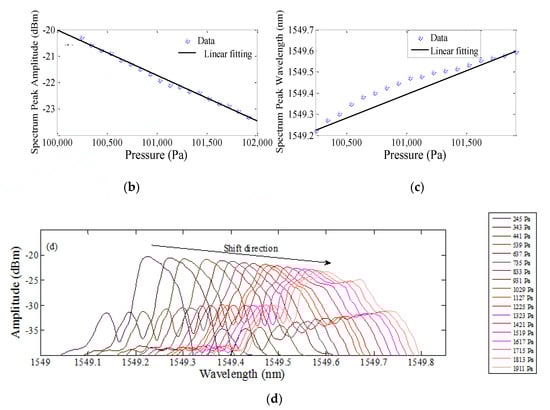 Sensor output due to static pressure. (a) Schematic setup for static pressure. (b) Change in the spectrum amplitude due to pressure. (c) Change in the spectrum wavelength due to pressure. (d) Change in the spectrum due to pressure.