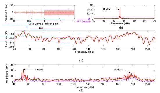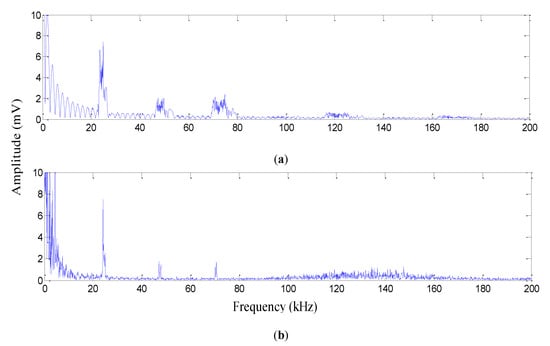 FFT of the output voltage of (a) the PD signal from the piezoelectric transducer and (b) the PD signal from the proposed FBG sensor.