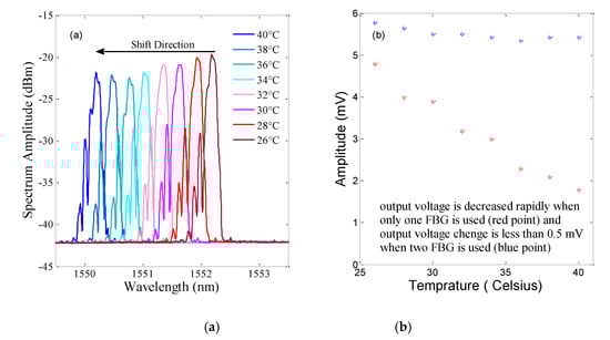 Output change due to a variation in temperature. (a) Wavelength shift for the proposed sensor. (b) Voltage change with the one-FBG configuration (red point) and the proposed sensor (blue point).