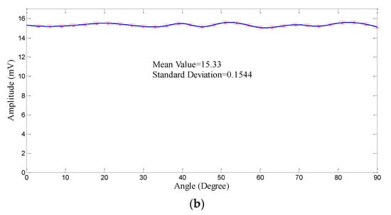 An acoustic wave with a frequency of 193 kHz was generated by the piezoelectric transducer at different theta angles, as depicted in Figure 8a. The source direction varied from zero to 90 degrees in steps of 3 degrees. This test was repeated 10 times, and discrete data converted to the curve of Figure 8b by gathering and interpolating the data. The standard deviation of the output values was approximately 0.4 mV (see Figure 8) [], which was desirable. The use of an FBG alone completely depends on the direction []. In fact, by simultaneously using the FBG and mandrel, this problem could be addressed.