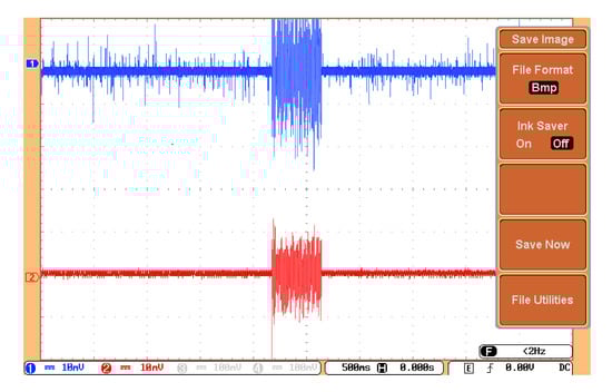 The proposed sensor utilized an amplified acoustic signal and detected the signal over a broad frequency band, as shown in Section 5. To verify the sensor performance, the sensor must be able to identify PD. The piezoelectric transducer was used for the verification of the proposed sensor output. The noise in the proposed sensor was low because there was no electrical measurement system inside the transformer. The transformer was filled with transformer oil, and only the proposed sensor and piezoelectric were placed inside the transformer. The signal was transferred to the electronic system by an optical fiber, which was electromagnetically noiseless. The electronic amplifier, such as an OPAMP, and the oscilloscope, were far from the sensor. An algorithm [] was also used to reduce the noise and increase the SNR to improve the quality of the signal. The sensor was located 10 cm from the PD source in the oil-filled transformer model. The piezoelectric transducer was positioned beside the sensor, so one expected to detect the same acoustic signal by the sensor and piezoelectric transducer. The signal detected by the sensor and the piezoelectric transducer is depicted in Figure 9. This figure shows that the start and stop times are exactly at the same moment.