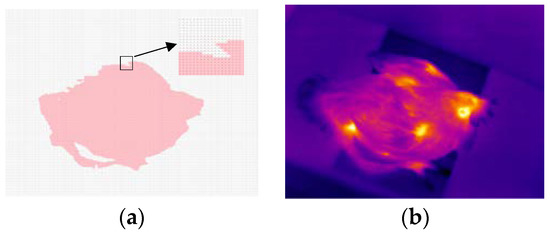 Each thermal image obtained in Section 2.2 was converted to a 240 × 320 matrix. The matrix contained the temperature value at each pixel. Taking a thermal image selected randomly from the image database as an example, its temperature matrix and thermal image are shown in Figure 2a,b, respectively.