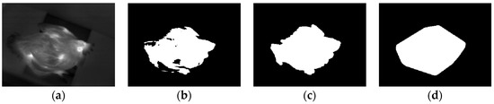 The obtained grayscale image was converted to a binary one by using Otsu’s method [17], as shown in Figure 3b. Then, morphological processing [18] was carried out to remove holes and spindly parts in the binary image. The morphological processing result of Figure 3b is shown in Figure 3c. Finally, the convex hull image was obtained by using the algorithm proposed by Barber, et al. [19] in 1996, as shown in Figure 3d.